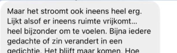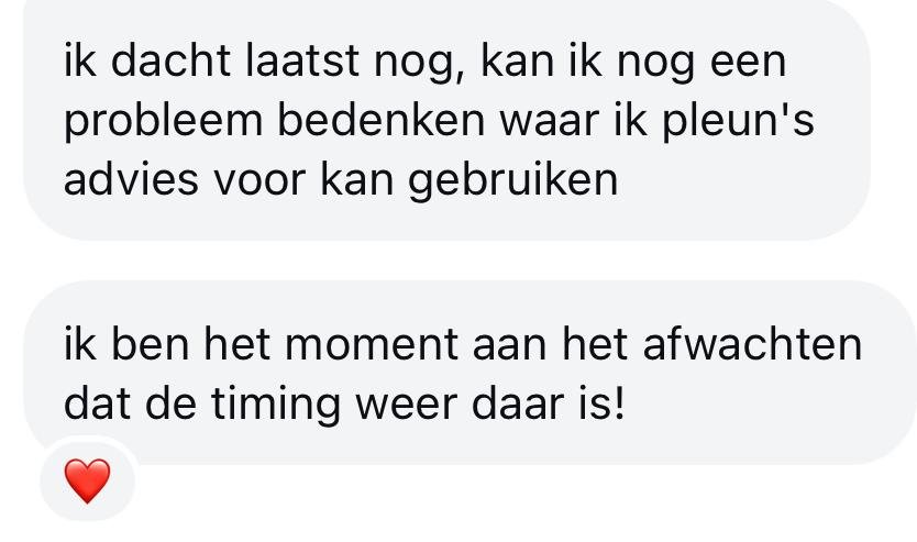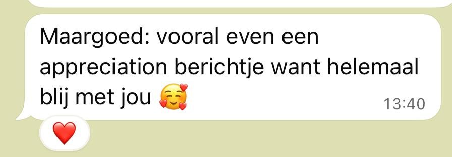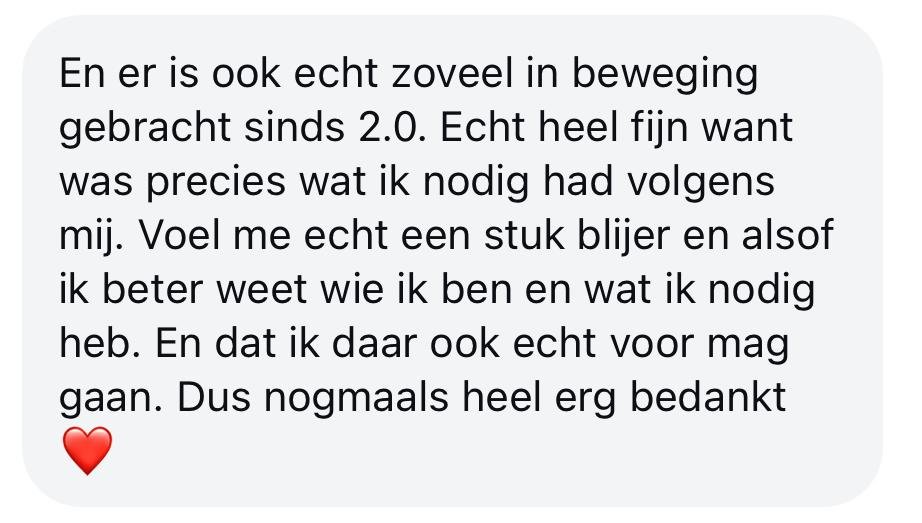 ”Ik wou nog even zeggen dat ik zo blij ben dat ik gister weer bij je terecht kon. Zag er mega tegenop haha.. Thanks voor je hulp om mezelf steeds beter te leren kennen en het verleden zo een betere plek te geven. Voelt zo fijn <3”