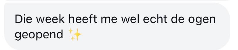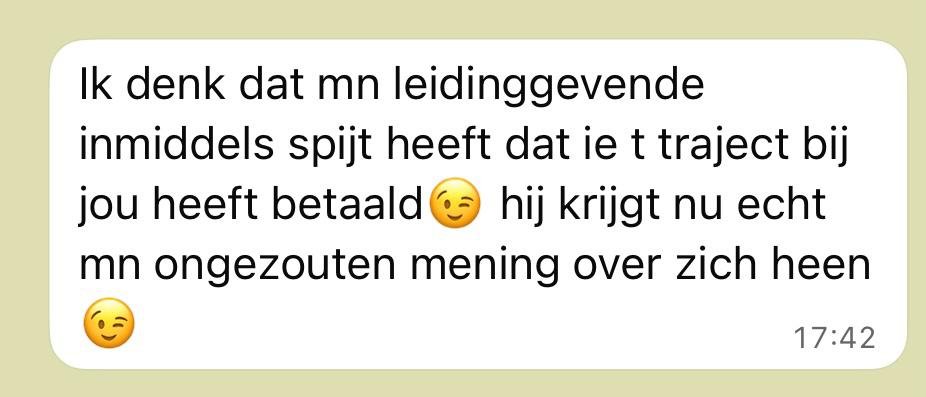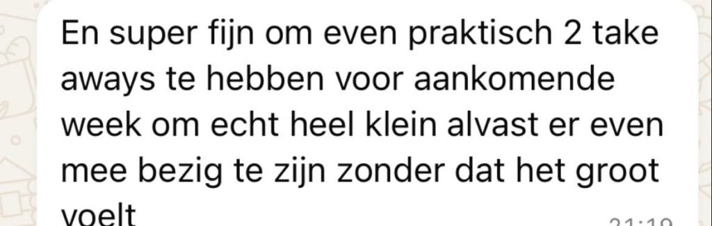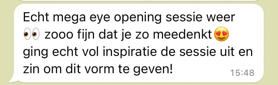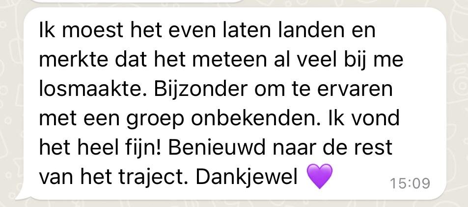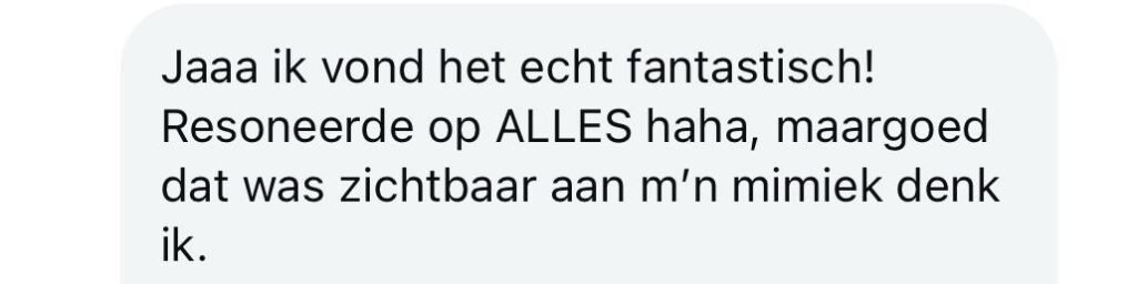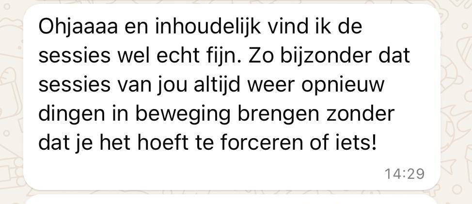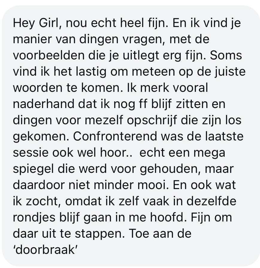 ”Heel erg bedankt voor het verhelderende, confronterende maar vooral ook mooie gesprek! Ik ben nu echt ontzettend moe, maar ik ga lekker even helemaal in de verzachting alles toelaten haha! Ik vond het in ieder geval heel fijn bij je, ondanks dat het ongemakkelijk kan zijn om zo naar jezelf te kijken. Mocht ik binnenkort nog tegen dingen aanlopen dan maak ik graag een vervolg afspraak bij je. 🤗🙏🏼”