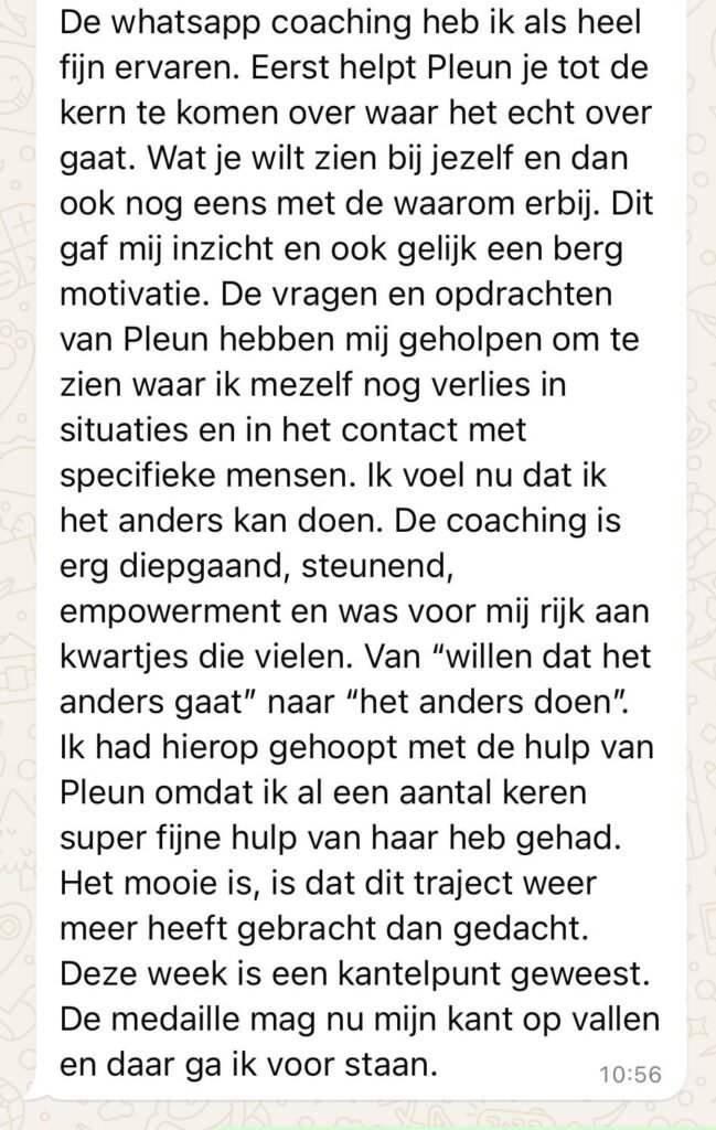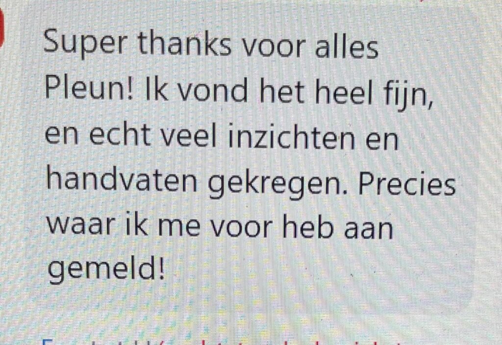 ”Ik ben blij dat ik jou ben tegen gekomen. Echt waar lieve Pleun, dankjewel! Je hebt echt onwijs veel losgemaakt, bewustwording gecreëerd, me een bepaalde liefde naar mezelf laten voelen die ik nooit eerder heb ervaren. Een flink stuk acceptatie gegeven naar diepere pijnen die ik (on)bewust niet onder ogen durfde te zien. Ik ben je onwijs dankbaar”